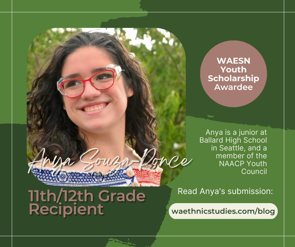 Anya is the recipient of our Youth Scholarship Essay Contest for the 11th and 12th grade. She is a junior at Ballard High School in Seattle and a member of the NAACP Youth Council.